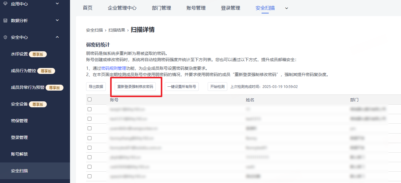 管理员可以通过“弱密码统计”功能进行全域账号密码安全扫描,管理员可批量/单独选择使用弱密码的用户,要求其强制修改密码。