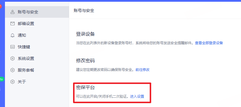 从【密保平台】界面绑定手机号并开启二次验证,登录邮箱时,进行短信二次验证,加强邮箱安全保障