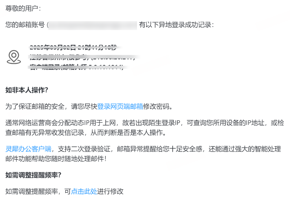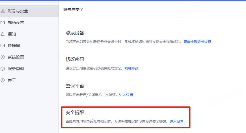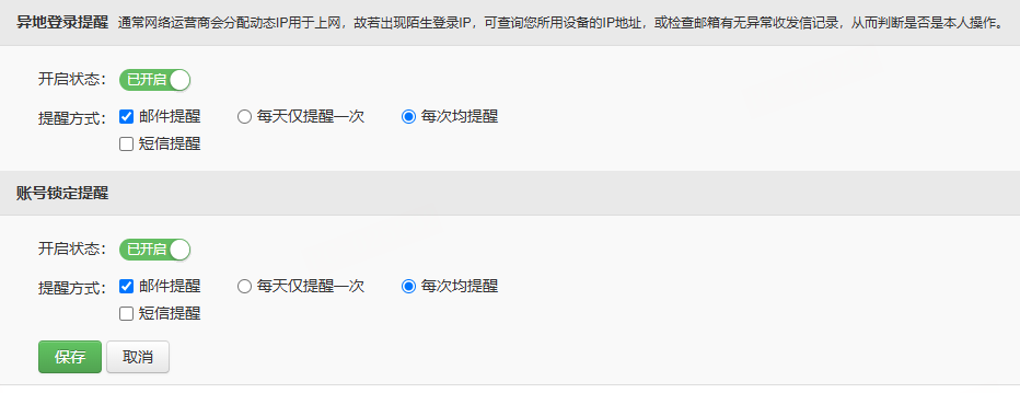 异地登录提醒:开启后,邮箱账号与上一次登录地址不一致时,将收到短信/邮件提醒