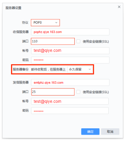 请注意:在设置POP协议时会有在服务器保留周期的选项,建议选择“永久保留”,否则邮件会在一段时间后从服务器中删除。